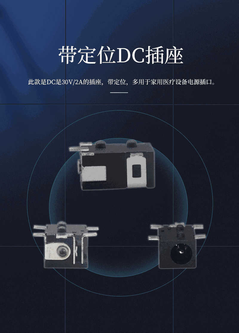 產品簡介:此款DC插座是帶定位柱的電源插座,額定電負荷:DC 30V/2A;接觸電阻:≤0.03Ω;絕緣電阻:≥100MΩ;耐壓:AC500V/min;插拔力:3~30N