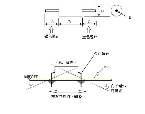 2、產品當向導電端(銀色引腳端A)傾斜、傾斜角大于15度時,為開路OFF狀態,當產品水平狀態發生傾斜改變,觸發端(鍍金引腳端C)低于水平傾斜角大于于15度角時,為閉路ON狀態。水平放置時,晃動可易觸發。而銀色腳向下時,晃動不易觸發。